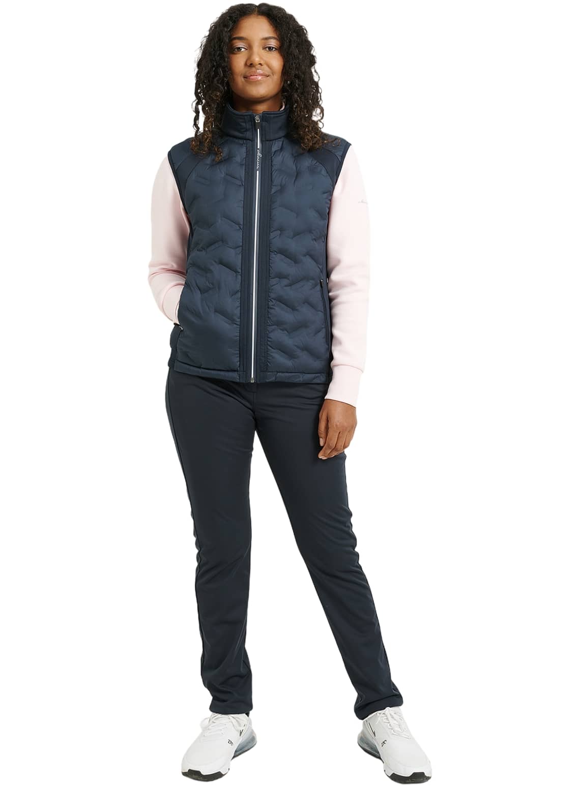 The Abacus Portrush Hybrid women's vest is made from seamless quilted, windproof fabric that is padded at the front and back padded at the front and back to keep you warm. The side panels are made from a very stretchy fleece, which ensures better freedom of movement. The fleece is breathable and brushed on the inside. The vest has a full front zipper and two front pockets. front pockets. The hem and inner collar are made of knitted rib material with ribbed material with textured stripes, which creates a beautiful effect. effect. The Abacus logo is located on the back collar and on the front zipper. front zipper.